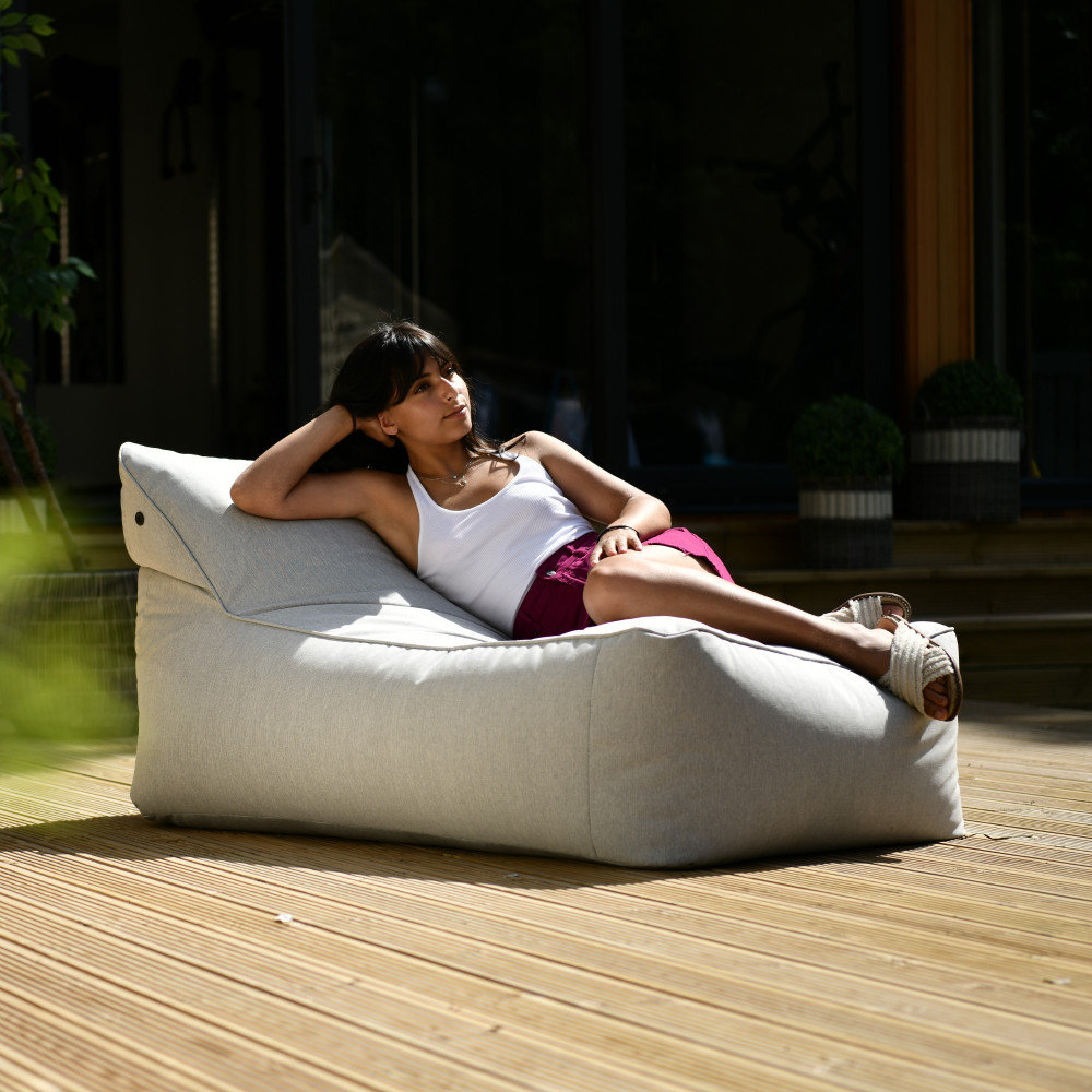 De stof van de b-bed is een sterke polyester en heeft een vulling van polystyrene balletjes. De binnenkant van de stof heeft een gelamineerde laag, zodat het bestand is tegen de regen. De stof zelf heeft een UV 7-8 coating dat de zonnestralen gemakkelijk aan kan. Zo blijft de b-bed de kleur houden waar je ooit verliefd op bent geworden. Laat hem dus gerust buiten liggen, al is het tijdens de winterse maanden wel handig om hem binnen neer te leggen.
